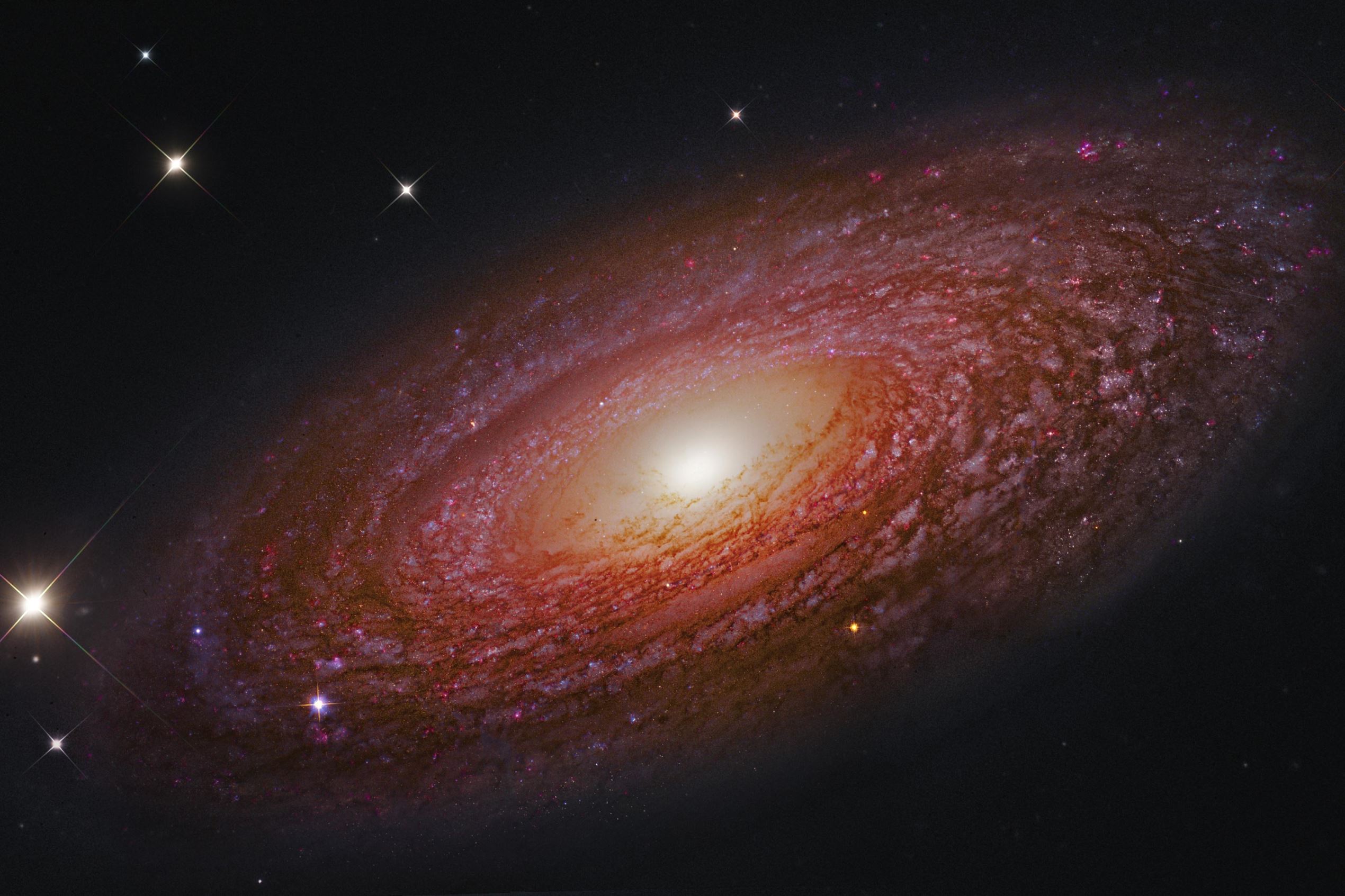 It is one of the more massive galaxies known. A mere 46 million light-years distant, spiral galaxy NGC 2841 can be found in the northern constellation of Ursa Major. This sharp view of the gorgeous island universe shows off a striking yellow nucleus and galactic disk. Dust lanes, small, pink star-forming regions, and young blue star clusters are embedded in the patchy, tightly wound spiral arms. In contrast, many other spirals exhibit grand, sweeping arms with large star-forming regions. NGC 2841 has a diameter of over 150,000 light-years, even larger than our own Milky Way and captured by this composite image merging exposures from the orbiting 2.4-meter Hubble Space Telescope and the ground-based 8.2-meter Subaru Telescope. X-ray images suggest that resulting winds and stellar explosions create plumes of hot gas extending into a halo around NGC 2841.